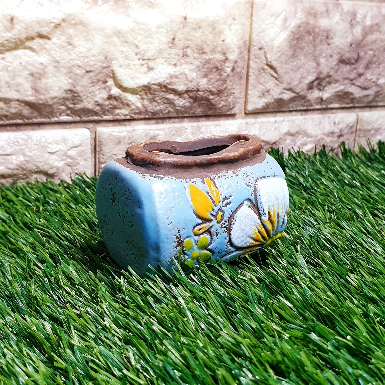 ミニ多肉ポットや小物入れに最適♪韓国発 花柄ミニポット 俵型×水色
