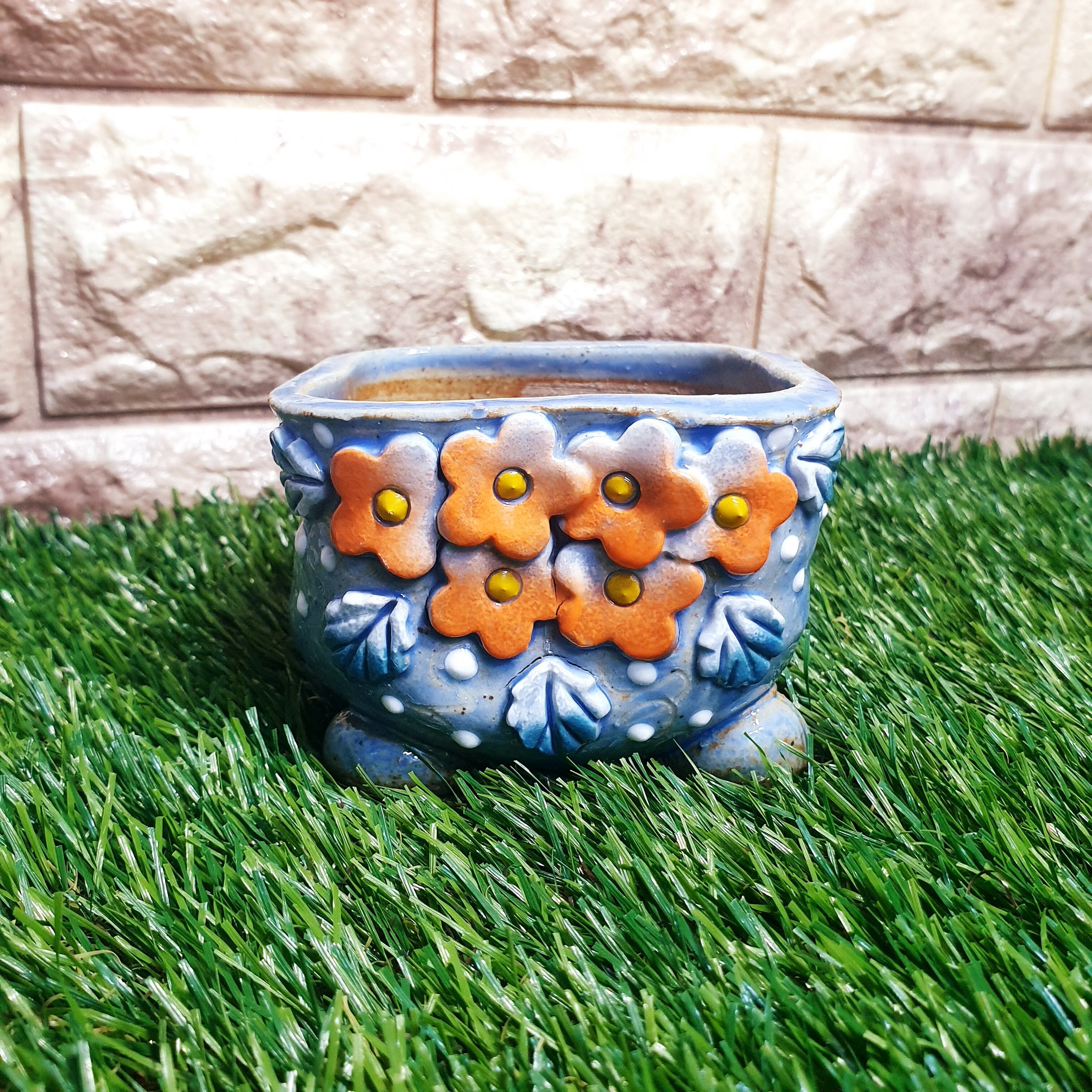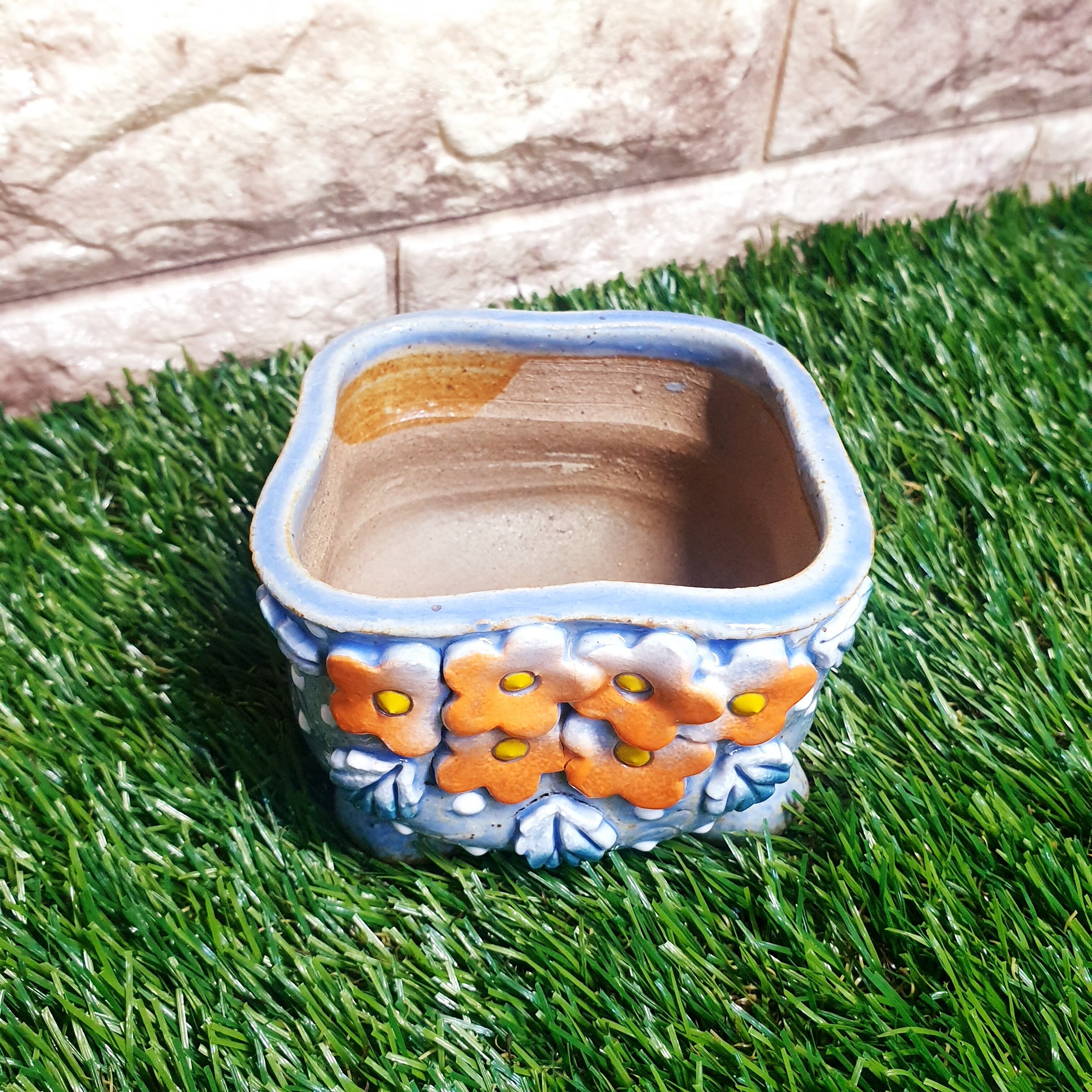 多肉を可愛く彩る♡韓国発 花柄✽ポット 四角形タイプ 青ベース×オレンジ花